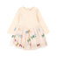 長袖芭蕾舞裙,泡泡袖,分層薄紗裙。背面以一顆珍珠母貝紐扣扣合。裙子腿部有按扣,方便 18 個月以下的寶寶穿脫